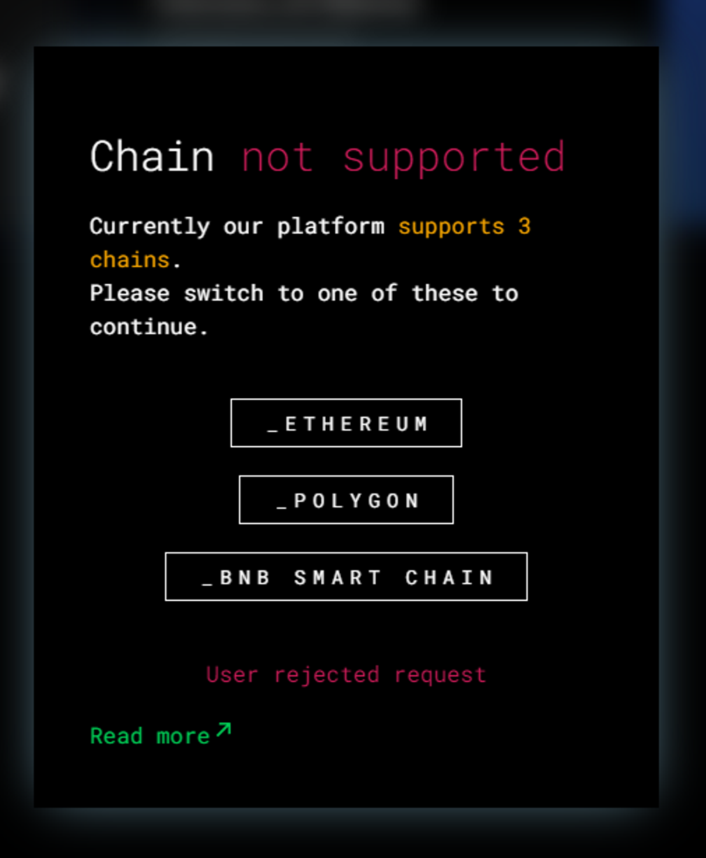 A protective measure is in place to prevent access to services if you inadvertently switch to an unsupported chain, safeguarding against potential errors.